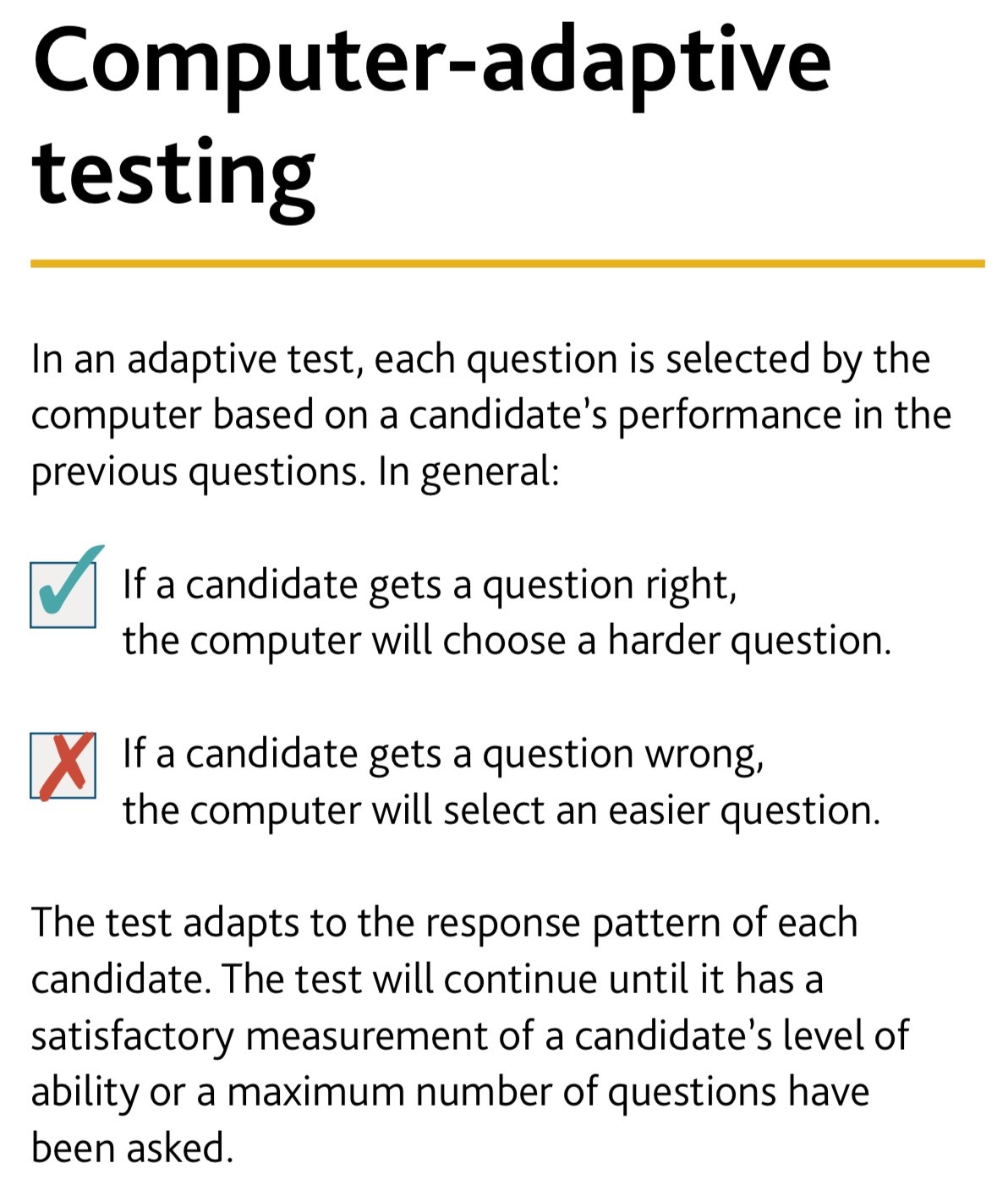 Like the Oxford University Press exam, Linguaskill is an intelligent multi-level exam. What does this mean? This means that the exam adapts to the candidate based on their answers. In this way, the system determines the candidate’s exact level. Therefore, the duration of some parts, as we will see below, varies depending on the candidate. Below is a video and an image for you to know more about how it works.