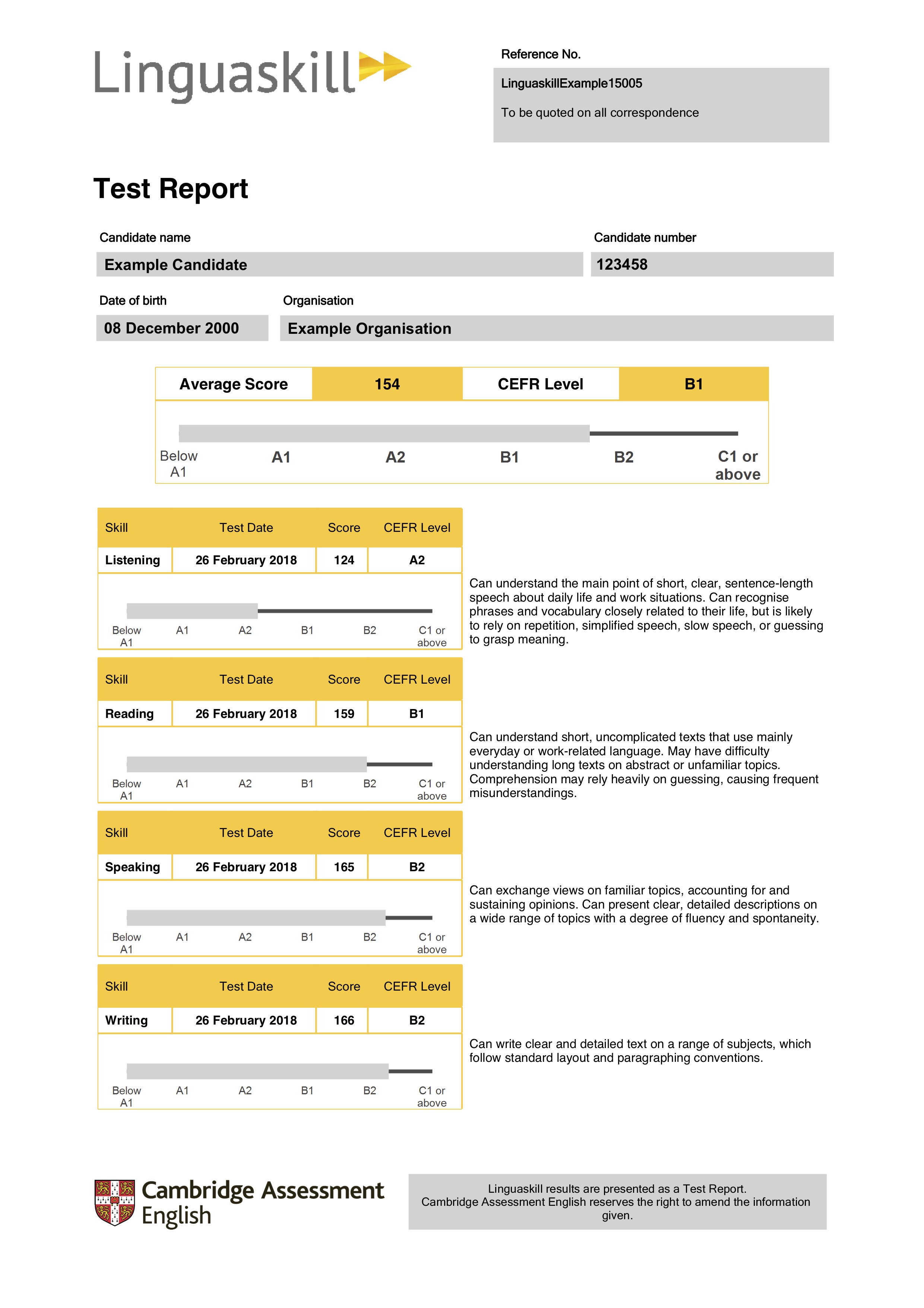 Download a full Test Report Form here: Linguaskill Example 4-Skill Test Report.
